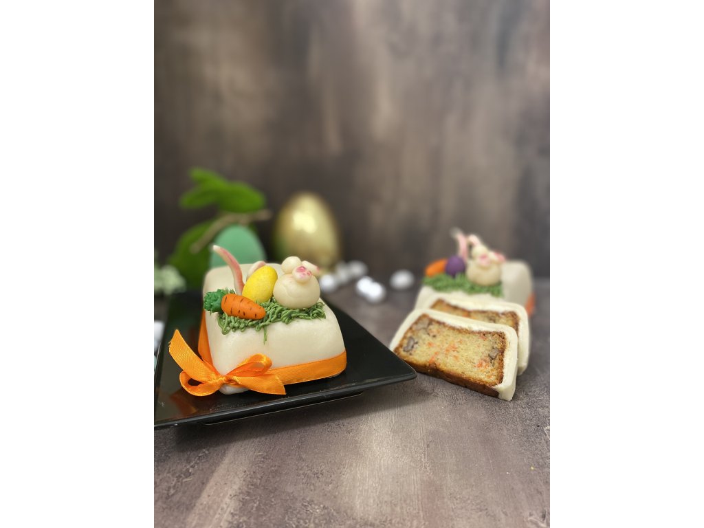 Skladba zákusku: mrkvový korpus ganache z bílé čokolády marcipán marcipánová dekorace